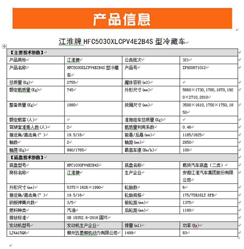 江淮康鈴X5汽油冷藏車(國六),整車型號:HFC5030XLCPV4E2B4S,底盤型號:HFC1030PV4E2B4S,整車尺寸:5660×1730×2710,箱體尺寸:3500×1610×1750,軸距:2850,總質量:2755kg,額定載質量:745kg,整備質量:1880kg,柳州五菱LJ4A15Q6發動機,83kw,112馬力,排量1.5L,后雙輪,原廠空調,標配電動門窗 中控鎖,ABS,轎車化內飾。