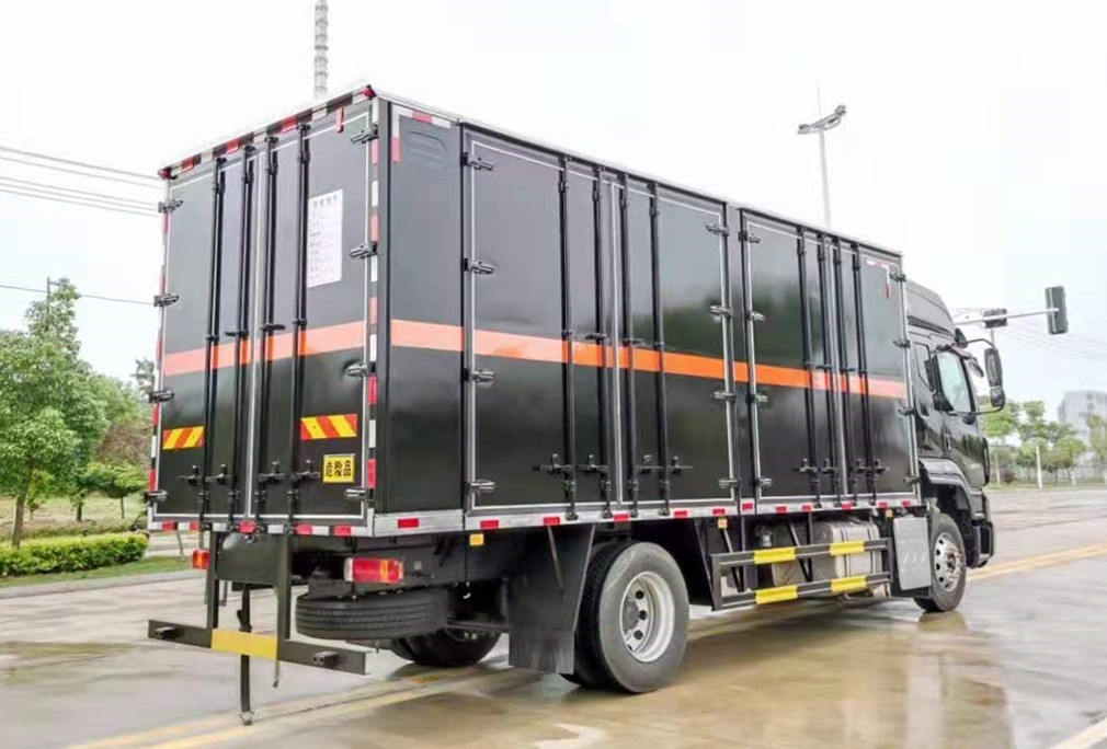 隨底盤選裝M3B駕駛室新面板,選裝導風板,選裝前面板亮條,選裝A柱貼膜,選裝保險杠、翼子板,選裝車門下飾板,選裝臥鋪側窗,選裝綠玻璃,選裝導流罩,選裝高頂駕駛室;該車為危險品運輸車,類型為EX/Ⅲ;廂體頂部密封,不可開啟,廂體兩側選裝不同形式側開門及開門位置或不帶側門,選裝瓦楞板結構.運送爆炸品的項號: 1.1 D,1.1 D,1.1B,1.1B,1.1G ,1.1C,1.3C,1.1 D,1.1 D,1.4G,1.1D,1.1 D,1.1B,1.1B,1.3C,1.1C,1.3C,1.1D 。側/后防護材料為Q235,連接方式:焊接連接,后防護截面尺寸(mm):120×60,離地高度410mm。選裝液壓尾板時,后防護截面尺寸(mm):600×130,離地高度410mm,液壓尾板收起狀態的水平長度為280mm,尾板重量為550kg;該車僅使用排氣管前置、前輪為盤式制動器、裝配子午線輪胎的底盤,轉向輪安裝輪胎爆胎應急防護裝置,后軸采用空氣懸架,安裝導靜電帶;該車裝有ABS,ABS型號/企業:ABS-E 4S/4M/威伯科汽車**系統(**)有限公司,CM4XL-4S/4M/廣州瑞立科密汽車電子股份有限公司;該車安裝具有衛星定位功能的行駛記錄儀,該車裝配有限速裝置,限速80km/h。采用發動機YCS06245-60A,油耗值為:25.8L/**km。選裝雙開門。 |