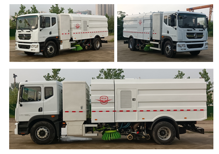 洗掃:清掃作業裝置工作的同時,上裝電機驅動配有專用離合器的高壓水泵參與工作。高壓水泵將來自清水箱的清潔水加壓后通過高壓管路**閥等分別輸送到吸嘴內噴水桿和左、右噴水桿,各噴桿上裝有多個特制的不銹鋼扇形噴嘴,扇形噴嘴噴出的扇形水簾組成一總寬不小于2.8m的U形水刀,直接沖洗路面,沖洗路面后的水被吸回到垃圾箱中,實現路面洗掃。